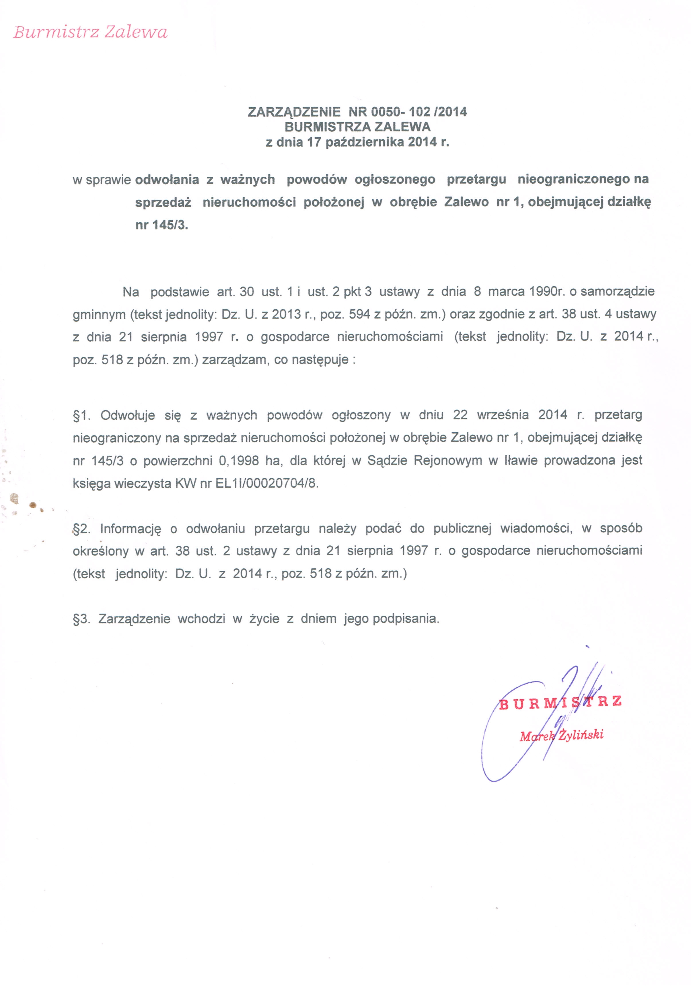 OGŁOSZENIE O PRZETARGACH - Burmistrz Zalewa ogłasza pierwszy ustny przetarg nieograniczony na sprzedaż nieruchomości gruntowych stanowiących własność Gminy Zalewo.